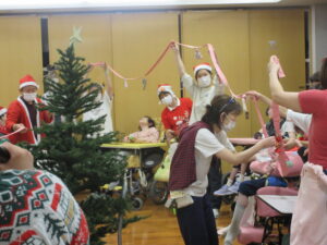 皆でクリスツリーの完成の為、ひもをつないでいきます